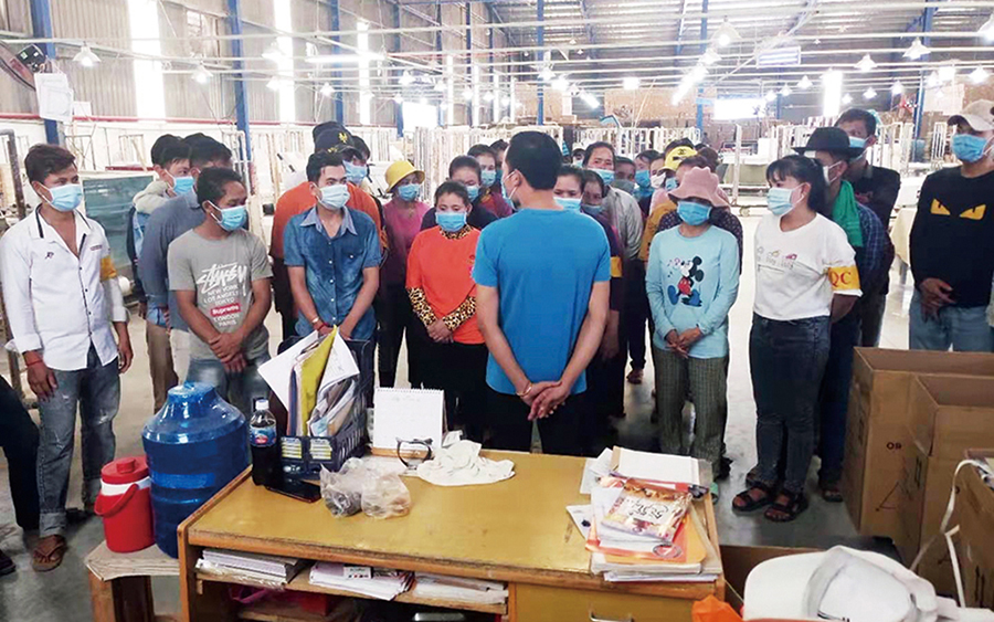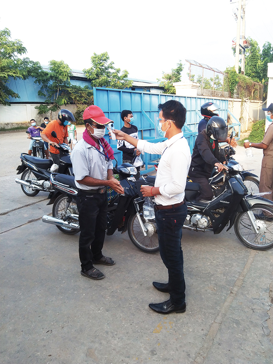 親身經(jīng)歷過武漢封城的郭建光副總,對于柬埔寨疫情形勢表現(xiàn)得清醒而鎮(zhèn)定,在嚴陣以待的同時也安之若素。他督促工廠嚴格落實柬埔寨政府防疫措施,員工每天進廠都要測溫、消毒,進入車間后必須全天佩戴口罩,4月14日—16日期間,適逢柬埔寨新年放假,17日員工到崗后還要逐一登記假期行程軌跡,所在村莊有確診病例的兩位員工建議居家隔離。這些措施都有專人檢查確保得到落實,有的車間員工比較抗拒戴口罩,郭總在勸說無效后,會告知員工直接報告給防疫警察,因為只有嚴格管理,才能確保工廠生產(chǎn)照常運行。在柬埔寨的中方干部也受到了嚴格的管理,例如中方干部不能隨便出工廠,一部分干部全天待在宿舍辦公,如有緊急事情要去車間也必須戴好面罩、口罩,進出車間都要消毒……中方干部以超強的自律意識在做好自我防護的同時,也給柬埔寨籍員工做好表率。