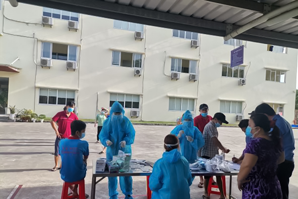 醫(yī)護(hù)人員為越南鳳凰畫材“三就地”人員每周例行核酸快篩(三就地是指少數(shù)留守員工必須就地工作,就地吃飯,就地休息)