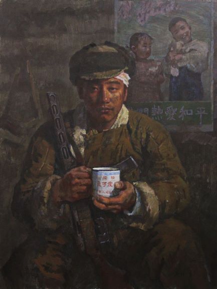 走進(jìn)工作室,差異明顯的分成了兩個(gè)不同的區(qū)隔,左邊是考究的中式家具,案臺(tái)上放著筆墨紙硯;右邊是核心創(chuàng)作區(qū),擺放了很多油畫(huà)作品和繪畫(huà)材料。真可謂東方西方皆有文章,墨香油香相得益彰。吳老師雖已年逾古稀,但精神矍鑠,身板硬朗,一年大部分時(shí)間仍堅(jiān)持寫(xiě)生創(chuàng)作,進(jìn)工廠(chǎng),下田間,訪(fǎng)哨卡,走邊關(guān),從老百姓的柴米油鹽到子弟兵戍守邊疆的家國(guó)情懷,都在他的藝術(shù)關(guān)切之內(nèi)。他把熾烈的藝術(shù)情感象鋼鍋一樣澆鑄在火熱的現(xiàn)實(shí)生活當(dāng)中,充滿(mǎn)了無(wú)窮的正能量,澎湃出驚濤駭浪般的藝術(shù)波峰。體現(xiàn)了老一輩藝術(shù)家對(duì)待藝術(shù)的獻(xiàn)身精神和崇高的藝術(shù)素養(yǎng)。觀賞吳云華老師作品,無(wú)不體現(xiàn)出見(jiàn)微知著、舉重若輕的藝術(shù)表現(xiàn)手法。以《最可愛(ài)的人》為例,畫(huà)面主體形象是一位端坐的志愿軍戰(zhàn)士,創(chuàng)作者用平視的角度,拉近了觀眾與畫(huà)面人物的距離。戰(zhàn)士充滿(mǎn)深情地凝望著什么,眼里噙著淚水,可能是受到了某種感動(dòng),抑或是觸景生情,把對(duì)親人對(duì)家鄉(xiāng)的思念深深埋在心里。人們仿佛能看到戰(zhàn)士豐富多彩的內(nèi)心世界。畫(huà)面灰調(diào)子處理,不但沒(méi)有弱化英雄頂天立地的光輝形象,反而用富有生活氣息的溫暖的畫(huà)面烘托出人民戰(zhàn)士甘愿犧牲、無(wú)怨無(wú)悔的英雄形象,符合了現(xiàn)實(shí)審美的客觀標(biāo)準(zhǔn),使英雄形象增加了親切感,人物表現(xiàn)更加豐滿(mǎn)有力,觀眾很自然地受到感染。這些細(xì)節(jié)告訴人們:他是活生生的現(xiàn)實(shí)人物,他就是我們的親兄弟。戰(zhàn)士的鋼槍、背景中熱愛(ài)和平的標(biāo)語(yǔ),展現(xiàn)出戰(zhàn)士保家衛(wèi)國(guó)的堅(jiān)強(qiáng)意志,立意之深可見(jiàn)一斑。